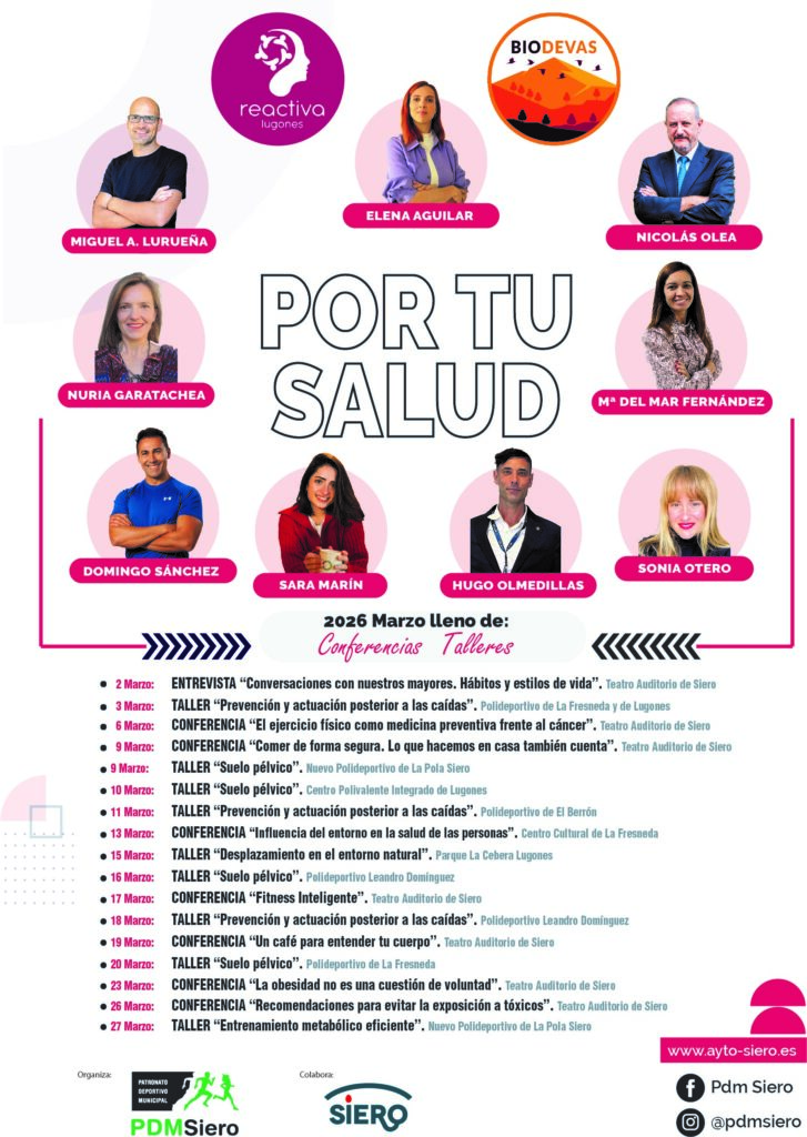 El Ayuntamiento de Siero y el Patronato Deportivo Municipal (PDM Siero) ponen en marcha la 4ª edición de “Por tu salud”, una iniciativa que convierte el mes de marzo en un espacio para cuidarse, aprender y disfrutar de actividades gratuitas dirigidas a toda la ciudadanía.